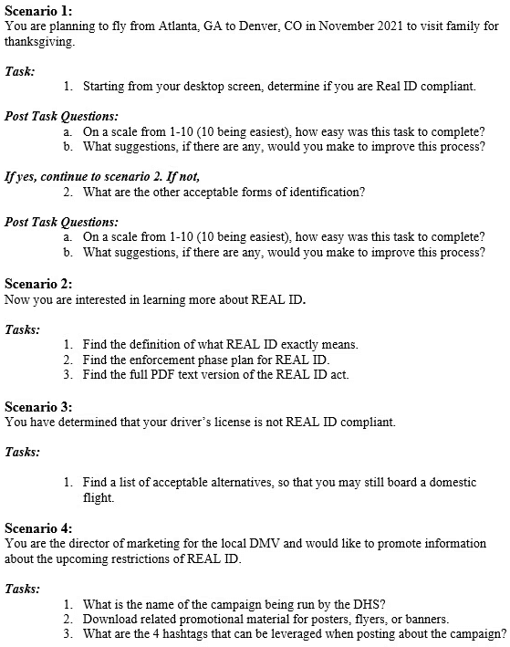 REAL ID is a national initiative requiring citizens to verify identity for secure facility access and domestic air travel. DHS requested a usability evaluation of the online REAL ID information and application flow to identify friction points and improve user clarity.